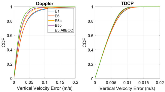 In Figure 11 and Figure 12, the respective CDF of the horizontal and vertical velocity errors are shown. In both figures, the left boxes show the CDF of the Doppler-based solutions, while, in the right boxes, the TDCP solutions are considered. The frequency cases are represented with different line colours. For the vertical velocity errors, the absolute value is considered for this plot. From the CDF of the Doppler-based solutions (left boxes) it can be noted that the E1 and E6 curves are almost superimposed, and a reduction in the error is obtained when changing to E5 frequency. In this case, E5a and E5b have very similar performance: the yellow and purple lines are very close. Finally, the highest curve is the one related to E5 AltBOC, confirming the results observed in the previous graphs. For the TDCP case, all the curves are almost overlapping and only very small differences can be observed. The CDF plots also confirm the benefits of using the TDCP method with respect to the Doppler-based solution.