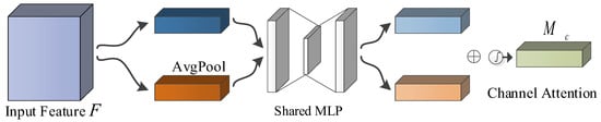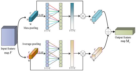 In the CBAM, the channel attention mechanism generates the channel attention feature map according to the channel relationship between features. Each channel is considered as a feature detector to compress the feature dimension, and the combination of maximum pooling and average pooling can improve the feature performance of the network. The structure of the channel attention mechanism model is shown in Figure 3.