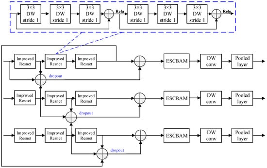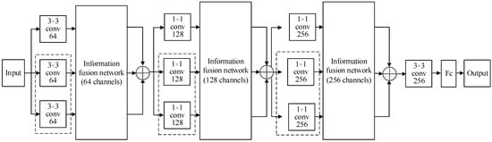 As can be seen from Figure 5, the proposed network in this paper contains three information fusion networks, whose channels are 64, 128, and 256, respectively. In addition, to reduce the parameter number and computational cost of the information fusion network, the depthwise separable convolution is used to replace the standard convolution in the residual network to improve the initial residual network. In the information fusion network, the input information is sent into three improved residual networks for further feature extraction. Each improved residual network contains two residual blocks, and each residual block contains three convolutional kernels with size 3 × 3 and step size 1. Finally, the three obtained features are processed by the ESCBAM attention mechanism, convolutional kernel with size 3 × 3 and step size 1, and pooling layer with size 3 × 3, respectively.