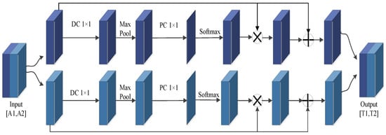 As can be seen from Figure 9, undergoes a depthwise separable convolution of 1 × 1, maximum pooling of 3 × 3, and point-by-point convolution involving a convolutional kernel in turn. Then, after processing by softmax loss function, the subspace output feature map is obtained. Subsequently, it is operated by and with the subspace input feature map , respectively, to get . represents matrix multiplication and represents matrix superposition. Finally, and are combined to obtain the output feature map , and f represents the splicing operation. In this way, the ULSAM-2 model can effectively capture the nonlinear dependence relationship between different feature maps by forming different attention mappings for two different subspaces. In addition, the multi-scale feature learning can also be realized, and the understanding ability of image context is enhanced, and the cross-channel information is integrated through different feature mapping subspaces.