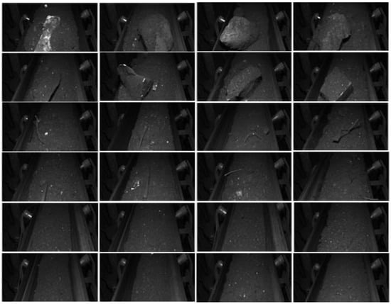 The mining belt conveyor coal flow dataset CUMT-BelT was collected from the transport environment of the belt under the mine. The exposed benchmark dataset can be downloaded from the following address: https://github.com/CUMT-AIPR-Lab/CUMT-AIPR-Lab (accessed on 7 June 2023). The dataset contains 6000 pictures in total, which are divided into 3 categories: large gangue, bolt, and normal sample. Each category consists of 2000 images, with 1600 images allocated for training and 400 images for testing. A portion of the dataset is depicted in Figure 10. As evident from the illustration, the pictures in the first and second row are the sample pictures of large gangue, characterized by their substantial size and weight. Once the coal drop port is blocked in the process of coal flow transmission, it is easy to cause accidents such as coal piling, coal blocking, and even belt tearing. The pictures in the third and fourth rows are the samples of the bolt, which is sharp and slender, and it is very easy to scratch and tear the belt in the process of coal flow transmission. The last two lines are normal coal flow pictures.