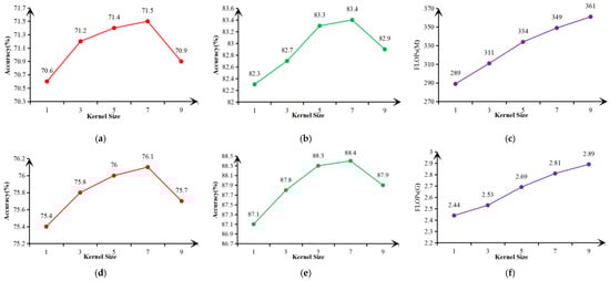 The effect of different convolutional kernel sizes on network performance. (a) Accuracy of MobileNetV2 with different k of ESCBAM on Cifar100; (b) Accuracy of MobileNetV2 with different k of ESCBAM on CUMT-BelT; (c) Computation of MobileNetV2 with different k of ESCBAM; (d) Accuracy of the proposed network with different k of ESCBAM on Cifar100; (e) Accuracy of the proposed network with different k of ESCBAM on CUMT-BelT; (f) Computation of the proposed network with different k of ESCBAM.