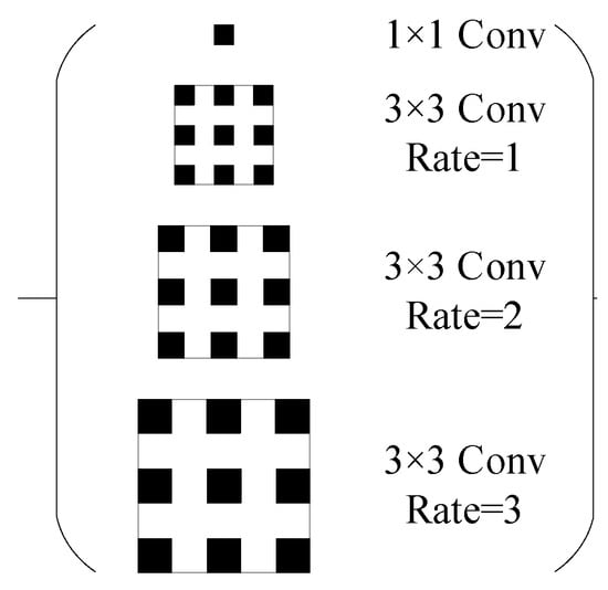 We design a spatial pyramid module inspired by the Atrous Spatial Pyramid Pooling (ASPP) module [43] to extract high-level features in the middle layer of the model from multiple scales and use a hybrid dilation convolution with the rate set to a sawtooth shape (Figure 3) of rate 1, 2, 3 to extract the feature information of the precipitation cloud from different scales to ensure that the perceptual field can cover the whole region. The size of the precipitation area is usually not regular. In the same scene image, there may be precipitation areas of different sizes, and even scattered precipitation may appear. As shown in Figure 3, 1 × 1 Conv represents the kernel size, and the stride of this convolutional layer is 1 × 1 and 1; everything else is the same. Here, we keep the kernel size and rate of the convolution operation different, but the size of the feature maps is the same, and these maps are concatenated. Previous ASPP modules use the atrous rate of [6,12,18] for multi-scale feature extraction, which is not suitable for the precipitation cloud identification task in this paper. The excessive atrous rate tends to cause the loss of small target object information. The benefits of this modification are demonstrated in the subsequent model comparison experiments.