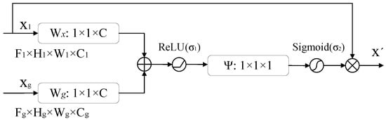 Figure 4 shows the attention mechanism module [44] added to the model allowing the model to focus more on the feature information in the precipitation cloud region. xl (the output of the encoder) and xg (the output of upsampling) are both fed into a 1 × 1 convolution layer that changes them to the same number of channels without changing the size and subsequently accumulates and passes a ReLU activation function. Then, another 1 × 1 convolution layer and a sigmoid function are passed to obtain an importance score from 0 to 1, assigned to each part of the feature map. Finally, this attention graph is multiplied by the xl input to produce the final output of this attention mechanism module.