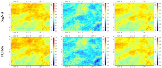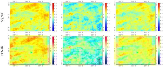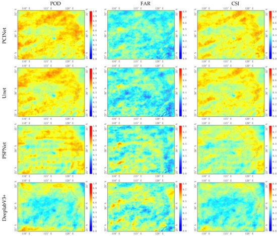 Spatial distribution of the evaluation metrics (POD—the first column, FAR—the second column, and CSI—the third column) for PCINet (the first row), Unet (the second row), PSPNet (the third row), DeeplabV3+ (the forth row), SegNet (the fifth row), and FCN-8s (the sixth row) in the daytime over the test period (June–September 2021).