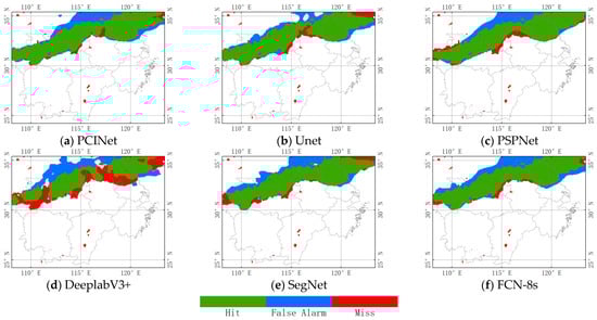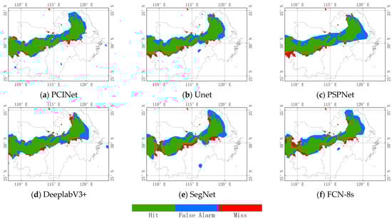 Figure 8 shows the precipitation cloud identification result of PCINet and the five baseline models at 2130 UTC on 6 July 2021. PCINet can correctly identify almost all precipitation cloud areas, and the number of false detection pixels is relatively low among the six DL-based models. Unet can reduce the false detection regions, but it also misses some precipitation cloud pixels. PSPNet not only misses a large number of precipitation cloud pixels but also incorrectly detects many of them. DeeplabV3+ misses the most precipitation cloud pixels and fails to accurately delineate the areas. SegNet and FCN-8s have average performances, and the edge of the precipitation cloud is very blurred. The results once again show that the PCINet model is more effective and accurate in depicting precipitation cloud regions during this precipitation cloud event compared to the baseline deep learning model.
