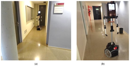 The experimentation area in which the experiments have been carried out is located in the Polytechnic School of the University of Lleida, Spain. The validation experiments have been conducted at the end of the corridor on the second floor (see Figure 1a), which has a small lateral junction contiguous to the central corridor (see Figure 1b). This area was considered ideal for experimenting with obstacle detection because the intersection of the two corridors allows us to recreate a scenario where an obstacle suddenly appears near the path of the robot. Figure 1a shows the mobile robot ARP-02 located in a position that will be the starting point of a reference trajectory implemented in this work, and Figure 1b also shows the mobile robot in the middle of the corridor, near the ending position of the reference trajectory. Figure 1b also shows a wastebasket randomly placed in the corridor as an example of an obstacle appearing in the trajectory of the mobile robot.