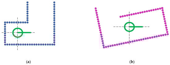 Schematic representation of the 2D point clouds gathered from a mobile robot (green circle): (a) reference partial point cloud (blue dots) obtained at the starting position and orientation 0°; and (b) partial point cloud (magenta dots) obtained after the robot has moved.