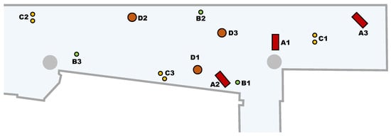 Figure 5 shows the approximate placement of the four stationary obstacles used in this work: A, a rectangular box of 480 × 215 mm; B, a small cylinder with a radius of 42 mm; C, two small cylinders, each with a radius of 50 mm; and D, a medium-sized cylinder with a radius of 135 mm. Each object has been placed in different locations along the corridor and labeled with a number. Each combination of obstacle and position will be used in the validation experiments. The obstacles have been placed in order not to block the reference trajectory of the robot in the different experiments.