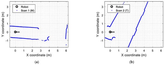 Figure 6 shows two real scans, M and T, used in this section to illustrate the differences between the LIBICP [62] and SLAMIPC [61] libraries. Figure 6a shows a reference point cloud obtained when the mobile robot is statically located and ready to start an exploration. Figure 6b shows the reference point cloud obtained after the robot has moved. In both cases, these real 2D LIDAR scans are composed of 1081 raw points (blue dots) and represent the contour of the area around the mobile robot in two positions of the application scenario. Note that the scans displayed in Figure 6 are only composed of points, so they may seem noisy in some regions of the contour represented by a few dots. Additionally, the dots representing a plain wall are affected by the measurement error of the real 2D LIDAR, so these dots are not defining perfect flat surfaces.