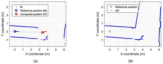 Interpretation of the results of the ICP matching: (a) representation of the transformed point cloud (magenta dots), where the position defines the self-localization of the mobile robot relative to the point of ; and (b) representation of the updated map (blue dots) created combining the transformed and point clouds, to be used in the following ICP matchings.
