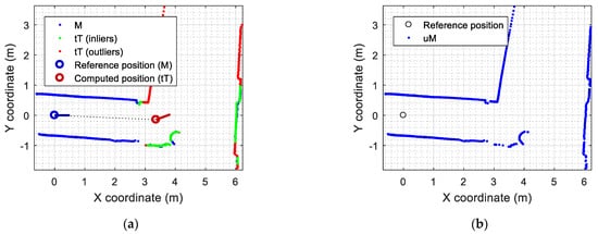 Results of the ICP matching using the SLAMICP library: (a) representation of the self-localization of the mobile robot in the point cloud detailing the outliers (red points) and inliers (green points) of ; (b) update of the map based on the combination of and the outliers of , in this case containing 1617 points.