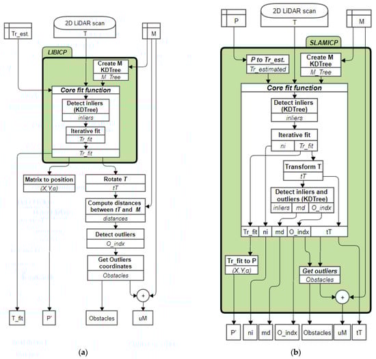 Flowchart of the software agent processing the 2D LIDAR scans of the APR-02 mobile robot: (a) original implementation based on the LIBICP [62] library; and (b) improved implementation using the adapted SLAMICP [61] library proposed in this work.