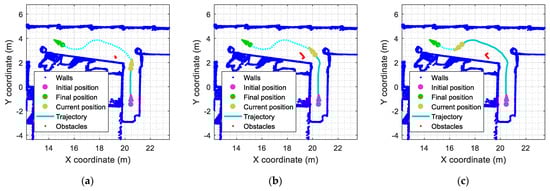 Detection of a small circular obstacle in the corridor (Figure 5, obstacle B2): (a) the robot is about to enter the corridor; (b) the mobile robot has entered the corridor; (c) the robot has completed most of the planned trajectory.