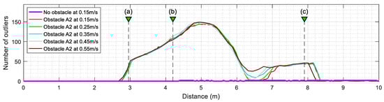 Evolution of the number of outliers (discrepant points) detected in the LIDAR scans after ICP matching when the mobile robot follows the reference trajectory at different velocities. The labels (a), (b), and (c) identify the positions of the robot depicted in Figure 10. Cases without obstacles (thick magenta line) and with the obstacle A2 (thin lines).