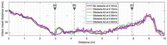 Evolution of the mean inliers (matched points) distance computed after ICP matching when the mobile robot follows the reference trajectory at different velocities. The labels (a), (b), and (c) identify the position of the robot depicted in Figure 10. Cases without obstacles (thick magenta line) and with the obstacle A2 (thin lines).