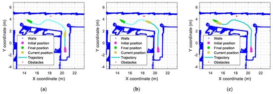 Figure 13 shows the evolution of the outliers registered in another example in which the mobile robot follows the reference trajectory (see Figure 4a). In this case, the obstacle used is the small cylinder identified with the label B2 depicted in Figure 5. In Figure 13a, the mobile robot is about to enter the main corridor, and the circular obstacle has already been detected (red points). In Figure 13b, the mobile robot has entered the corridor, and the front side of the circular obstacle is fully detected (red points). In Figure 13c, the mobile robot has completed most of the planned trajectory, and the outliers detected (red points) describe the back-side contour of the obstacle.