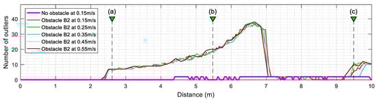Figure 11 summarizes the evolution of the number of outliers detected by the ICP algorithm when the mobile robot is configured to repeat the same experiment at different translational velocities. This value is computed from the number of elements provided in , which contains the index of outliers identified by the SLAMIPC [61] library (see Equation (10)). The magenta line in Figure 11 shows the evolution of the outliers when no obstacle is located in the experimentation area. The movement of the robot, along with the inherent measurement errors of the LIDAR sensor, causes the false detection of a reduced number of outliers. The other lines show the evolution of the number of outliers detected when a rectangular box is in the corridor while the robot follows the reference trajectory at different translational velocities, ranging from 0.15 m/s to 0.55 m/s. To simplify the comparison between the different experiments, the y-axis of Figure 11 is set to indicate the distance traveled by the robot, a metric that is independent from the translational velocity of the robot and allows a direct visual comparison of the obtained results. Figure 11 shows that the translational velocity of the mobile robot does not have any remarkable impact on the number of outliers detected during the displacements.