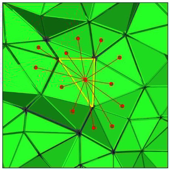 Model constraints for unstructured tetrahedral grids. The red points are the centroids of current (yellow) and adjacent tetrahedrons, and the lines denote the distances between two tetrahedrons.