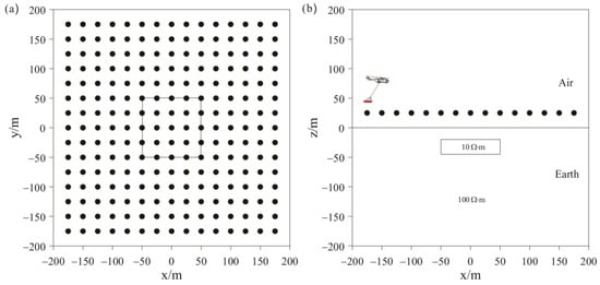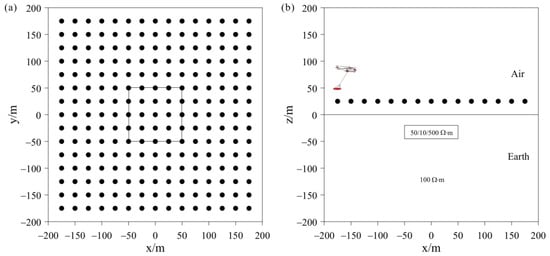 The receivers of the AEM system are located very close to the transmitter sources, resulting in the requirement of a fine mesh partition near the transmitter sources in order to meet the accuracy requirements of forward modeling. The receiver setup results in a significant waste of computational resources. Therefore, in this paper, we adopt the method of separating the primary field and the secondary field for forward modeling. The primary field and the secondary field are separated in order to deal with the source term, rendering the fine mesh partition unnecessary []. As explained by Zhang et al. [], by assuming the time harmonic dependence of , the governing equation is satisfied by the frequency-domain AEM secondary field: