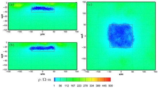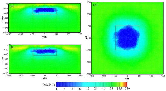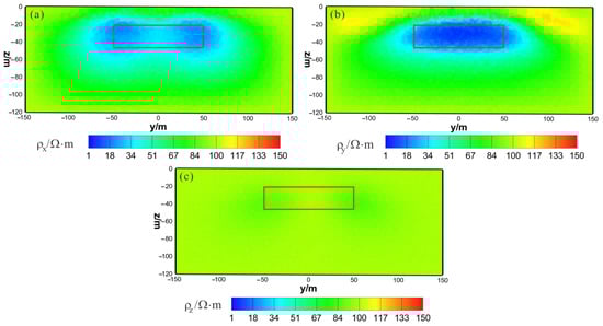 As shown in Figure 10a, Figure 11a and Figure 12a, the of the HCP inversion result has poor recovery. A high-resistivity body appears in the x–z section, with a lower boundary shallower than the actual anomaly body in the z direction. The y–z section shows two low-resistivity bodies and one high-resistivity body, roughly indicating the position of the actual anomaly body. The x–y section shows two low-resistivity bodies and one high-resistivity body, with relatively accurate positioning in the x direction. As shown in Figure 10b, Figure 11b and Figure 12b, the of the HCP inversion result has a good recovery. The inverted resistivity is close to the true value of . The x–z section accurately depicts the position of the actual anomaly body. The y–z section relatively accurately indicates the positioning in the y direction, but the lower boundary is larger than the actual anomaly body in the z direction, approximately forming an ellipse. The x–y section relatively accurately depicts the positioning in the y direction, but the width is larger than the actual anomaly body in the x direction, approximately forming an ellipse. As show in Figure 10c, Figure 11c and Figure 12c, is close to the theoretical background resistivity value, and the anomaly is not obvious, indicating that the parameters of anisotropic bodies () cannot be inverted in 3D anisotropic inversion. Overall, the inversion effect of HCP is acceptable, and the inversion effect of is satisfactory, roughly restoring the true position of the anomalous body. However, the inversion effect of is poor, and the recovery of is difficult.