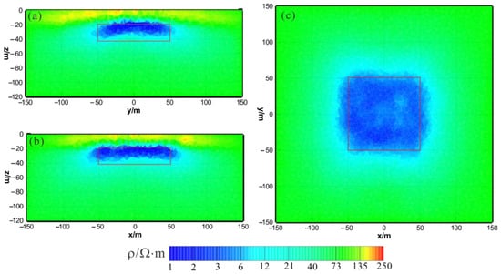 HCP inversion results: (a) y–z section (x = 0 m); (b) x–z section (y = 0 m); (c) x–y section (z = −30 m). The red box area indicates the actual location of the anomalous body.