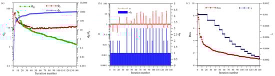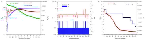 Convergence plots of isotropy VCX inversion: (a) fitting term (), model constraint term (), and ; (b) and search step length (); (c) and regularization factor ().
