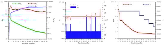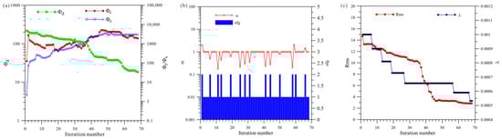 Figure 7a shows a total of 68 iterations of the VCX inversion. The data misfit was reduced from 216.4 to 18.2, and the model’s roughness () and finally stabilized and converged. Figure 7b shows that VCX inversion changed step sizes 14 times, and Figure 7c shows that VCX inversion changed regularization factors seven times.
