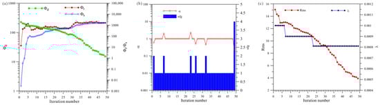 Figure 8a shows a total of 49 iterations of the joint inversion. The data misfit () was reduced from 227.4 to 15.2, and the model’s roughness () and ultimately stabilized and converged. Figure 8b shows that the joint inversion changed step sizes five times, and Figure 8c shows that the joint inversion changed regularization factors three times.