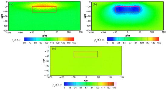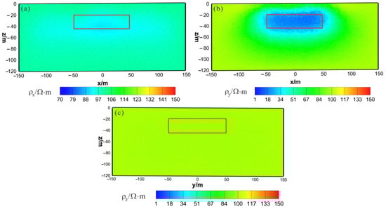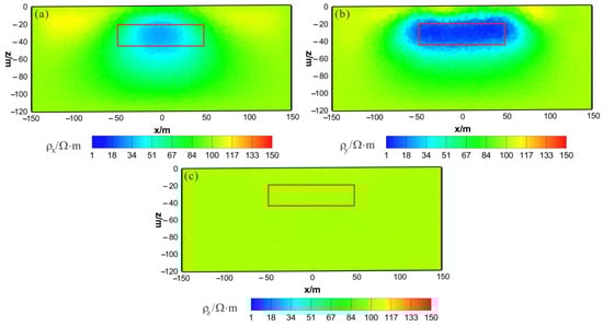 VCX anisotropic inversion results from the x–z section (y = 0 m): (a) ; (b) ; (c) . The red box area indicates the actual location of the anomalous body.