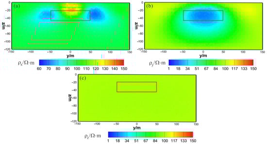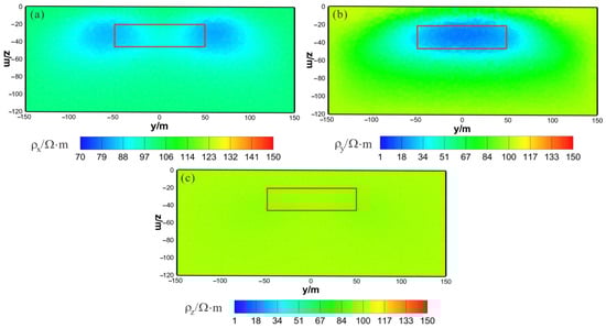 VCX anisotropic inversion results from the y–z section (x = 0 m): (a) ; (b) ; (c) . The red box area indicates the actual location of the anomalous body.