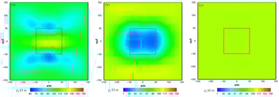 As shown in Figure 13a, Figure 14a and Figure 15a, the of the VCX inversion result has moderate recovery. A low-resistivity body appears in the x–z section, with a resistivity of approximately and a relatively accurate positioning in the x direction and lower boundary larger than the actual model in the z direction. The y–z section shows two low-resistivity bodies with a resistivity of approximately and relatively accurate positioning in the z direction. The x–y section shows two low-resistivity bodies with a resistivity of approximately and a relatively accurate positioning in the x direction. As shown in Figure 13b, Figure 14b and Figure 15b, the of the VCX inversion result has a good recovery. In all three sections, a low-resistivity body appears with a resistivity of approximately , and the position of the actual abnormal body is well restored. As shown in Figure 13c, Figure 14c and Figure 15c, is close to the theoretical background resistivity value, and the anomaly is not obvious, indicating that the parameters of anisotropic bodies () cannot be inverted in 3D anisotropic inversion. Overall, the inversion effect of VCX is acceptable, and the inversion effect of is satisfactory, roughly restoring the true position of the anomalous body. However, a discrepancy remains between the inverted resistivity and the true resistivity. The inversion effect of is acceptable, indicating a low-resistivity anomaly, but the recovery of is difficult.