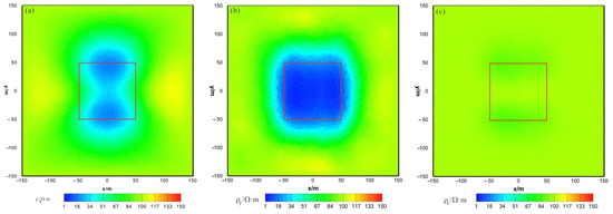 VCX anisotropic inversion results from the x–y section (z = −30 m): (a) ; (b) ; (c) . The red box area indicates the actual location of the anomalous body.