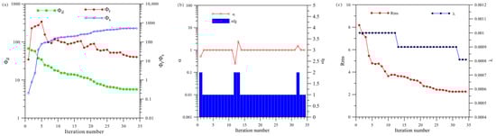 Figure 21a shows a total of 34 iterations of the joint inversion. The data misfit () was reduced from 67.1 to 5.6, and the model’s roughness () and ultimately stabilized and converged. Figure 21b shows that joint inversion changed step sizes four times, and Figure 21c shows that joint inversion changed regularization factors three times.