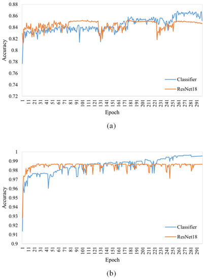 The accuracy curve of the classifier during training is compared with the original ResNet18. The classifier structure in GACN is the same as that of ResNet18. (a) Accuracy curve on the AI Challenger 2018 test set. (b) Accuracy curve on the PlantVillage test set.