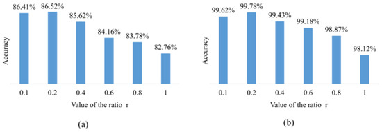 The effect of r values on results in the classifier loss function. (a) On the AI Challenger 2018 test set. (b) On the PlantVillage test set.