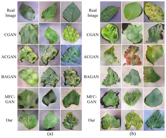 Generative adversarial network (GAN) [15] has been used to synthesize images with high visual fidelity. The high-quality samples synthesized by GAN models can now be used as additional training data for tasks such as classification [16,17] and data augmentation. Data augmentation is a common technique used to synthesize more training data, which can enhance the universalization ability of the model. In image processing, data augmentation techniques usually include image flipping [18], random cropping [19], and color enhancement [20]. In image classification tasks, models trained on class-imbalanced datasets are often biased toward the majority class. This problem can be ameliorated by applying augmented dataset techniques to minority classes. Some works [21,22,23,24,25,26] use a GAN to expand the dataset or solve the problem of class-imbalanced datasets. Refs. [21,26] use CGAN to synthesize images to augment and balance datasets, but experiments in this paper prove that synthetic images of CGAN have a low level of accuracy. The methods [22,23,24,25] use nonlabel-conditional GANs to augment or balance plant disease datasets, but the disadvantage of these methods is that GANs need to be trained separately for each class. In addition, ref. [27] used transfer learning on the samples synthesized by GAN to enhance the classification accuracy of convolutional neural networks.