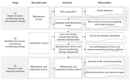 In Figure 2, it is possible to appreciate the stages, research tools, activities, and deliverables developed in the methodology applied in this research. It is observed that the three major stages of the methodological procedure applied in this research are: (i) interrelated sensor monitoring study in the mining domain, through data acquisition, mapping, and bibliometric study, to later obtain the database of articles and maps of co-occurrence of keywords and cluster analysis, (ii) identification of low-cost sensors for monitoring in mining, systematic review, identification of monitoring domains of low-cost sensors, and then obtain listing of identified subdomains, and (iii) answers to the research questions, through an analysis of the integrated systematic review of bibliometrics, to finally obtain answers to the research questions and find the most relevant scopes of application of low-cost sensors [51].