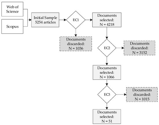 To develop the selection process of scientific articles to be analyzed in this research, an analysis was carried out in stages considering exclusion criteria (EC) to select scientific articles [57]. In Figure 3, it is possible to observe the procedure applied together with its results.