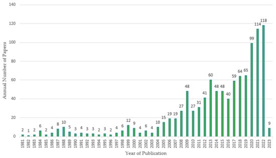 Number of relevant articles published considering 1066 articles selected from 1981 to 2023.