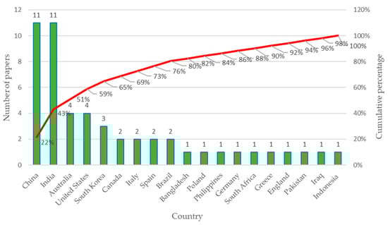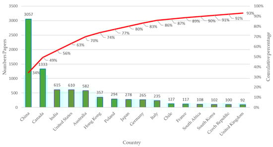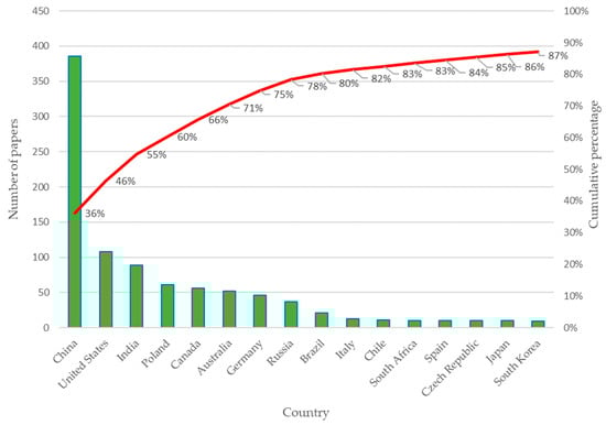 Figure 5 represents the sample of the 16 countries with the largest number of publications on the subject. The number of documents produced by the country is mainly concentrated in China, the United States, India, Poland, Canada, Australia, Germany, Russia, and Brazil, which represent approximately 80% of the 1066 articles, while Italy, Chile, South Africa, Spain, the Czech Republic, Japan, and South Korea also stand out in percentage of publications.