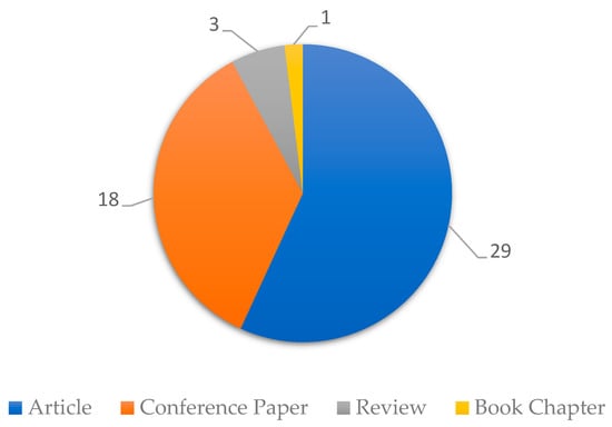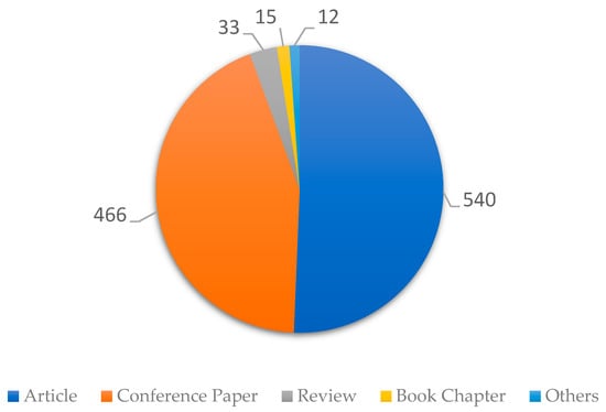 Next, in Figure 7, the results obtained for the distribution of document types of scientific publications in recent years are presented, considering the 1066 selected articles.