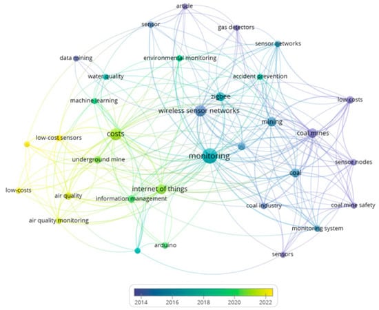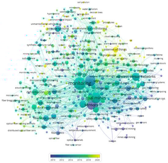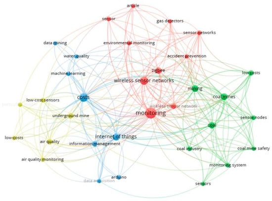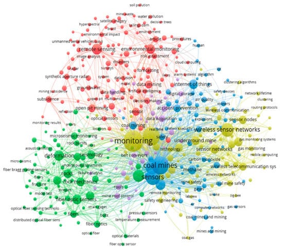 In the co-occurrence map in Figure 8, five clusters were generated, which are represented by different colors. Within the keywords, the ones that stand out the most are monitoring, coal mines, and sensors. Table 3 presents an interpretative summary in Figure 8, where it is possible to appreciate the theme applied by cluster and prominent keywords of the co-occurrence analysis.