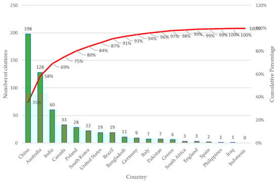 The countries with the largest number of documents cited are shown in Figure 6, where approximately 80% of the articles belong to China, Canada, India, the United States, Australia, Hong Kong, Poland, Japan, and Germany. In addition, China stands out as the country with the largest number of articles cited worldwide. Other countries such as Italy, Chile, France, South Africa, South Korea, and the United Kingdom complete the list of the 16 most cited countries, which account for approximately 93% of the total citations.