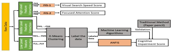 The system architecture of the ETMT model is shown in Figure 1. Eye-tracking data are collected based on the TMT stimulus. Low-level, middle-level, and high-level features are extracted from the raw eye-tracking data. The extracted features supplied to the ETMT model provide three scores: visual search speed, focused attention, and overall cognitive impairment. Two separate fuzzy-inference systems generate the visual-search-speed and focused-attention scores. An adaptive neuro-fuzzy-inference system (ANFIS) based on all the extracted features generates the overall cognitive-impairment score. The detailed architecture of the ETMT model is shown in Figure 2. The following sections explain each module of the ETMT model.