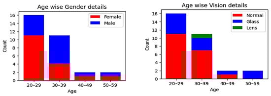 This study was performed on participants working in a hospital (mean age = 30.6, SD = 8.6; age range = 20 to 54). The demographic details of the participants are shown in Figure 3. The eye tracker used for data collection was an SMI REDn Professional eye tracker. The sampling frequency of the eye tracker was 60 Hz. Exclusion criteria involved participants with drooping eyelids, contact lenses, squinting, difficult glasses, glasses with more than one power (bifocals, trifocals, and progressives), the use of alcohol or psychotropic medication, recent eye surgery, and eye alignment abnormalities []. The participants who did not meet the specified exclusion criteria were included in the study. A total of 40 participants were recruited for the study, and we collected data from those participants. Out of the collected data, 9 participants’ data were discarded due to technical issues and data loss, leaving a total of 31 participants’ data for analysis. The flow of the conduct of the experiment is shown in Figure 4. The pre-survey procedure included obtaining their consent and collecting their demographic details. The guidelines were explained to the participant before obtaining their consent. After obtaining their consent, their demographic details were collected. Next, participants were asked to sit in a comfortable position and restrict head movements during the experiment. The distance between the screen and the participant was always maintained between 50 and 60 cm []. The stimulus was displayed with the help of Experimental Suite software. Calibration was performed at the start of each experiment. Nine-point calibration was performed to understand the characteristics of the participant’s eye. The eye-tracking version of the TMT, considered the screening test for cognitive impairment, was used as the stimulus [,]. The stimulus was displayed in the order of TMT-A simple, TMT-A complex, TMT-B simple, and TMT-B complex. TMT-A is the stimulus with number combinations, and TMT-B is the stimulus with number and alphabet-letter combinations. TMT-A simple is a simple random number sequence from 1 to 8. TMT-A complex is a random assortment of numbers between 1 and 25. TMT-B simple is a random combination of alphabet letters from A to D and numbers from 1 to 4. TMT-B complex is a random combination of alphabet letters from A to L and numbers from 1 to 12 []. The participants were instructed to look at the ascending numbers in TMT-A and the ascending combination of numbers and alphabet letters in TMT-B. While watching them, the participants were instructed to speak out aloud the number or alphabet letter. The individual was then asked to complete the conventional TMT after the eye-tracking version. It is based on the paper–pencil method, and participants were instructed to link the alphabet letters or numerals in an ascending sequence. The eye tracking and traditional TMTs followed the same order of stimuli.