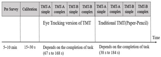 The benefits of combining infrared eye tracking with the TMT task is another significant factor []. Research on infrared eye tracking is becoming well known for its ability to diagnose cognitive impairment. Eye tracking was employed in an ongoing study to gather objective, quantitative data on each participant’s visual, attentional, and memory functions []. In addition to the basic task-completion-time metric, eye tracking enabled a number of potentially insightful and sensitive measurements.