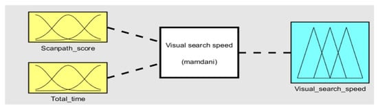 The visual-search-speed fuzzy-inference system (FIS) takes high-level features FH1 and FH2 as the inputs and generates a score based on the generated rules [].  FH1 is generated based on the comparison with the scanpath that correctly follows the path necessary to complete the given task  []. FH2 is the time required to complete the entire task. The completion time indicates the speed and focuses on identifying each AOI. The Mamdani model for the visual-search-speed FIS is shown in Figure 5. The parameters of the visual-search-speed FIS are given in Table 4.