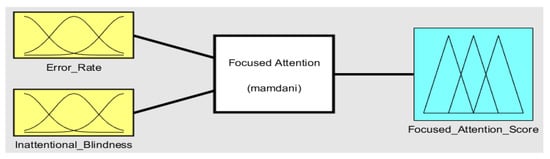 The capacity to concentrate on a task without getting distracted is known as focused attention. Maintaining a constant behavioral response throughout an ongoing activity is known as sustained attention. The focused-attention fuzzy-inference system (FIS) considers high-level features FH3 and FH4 as inputs and generates a score based on the generated rules. FH3, the error rate, and FH4, inattentional blindness, contribute to detecting focused attention. The Mamdani model for the focused-attention FIS is shown in Figure 6. The parameters of the focused-attention FIS are given in Table 4.