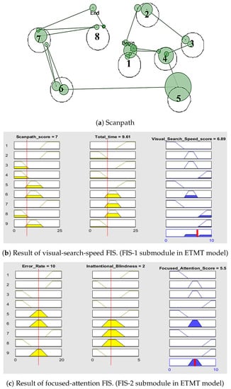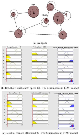 By utilizing this visual-search-speed score, the fuzzy-inference system can provide valuable insights into various deficits, particularly those related to visual attention and processing speed. An individual’s visual attentional efficiency and effectiveness may be reflected in their visual-search-speed score. A person with deficits in visual attention may exhibit slower scanpath scores (FH1) compared with the reference path []. This could indicate difficulties in properly attending to and processing relevant visual stimuli within the task. Processing speed refers to how individuals perceive, analyze, and respond to visual information. In the fuzzy-inference system context, people with processing speed deficits might exhibit longer total completion times (FH2) than those without deficits. A slower completion time indicates difficulty in processing visual information effectively and quickly enough to make decisions. The visual-search-speed FIS provides an indication of deficits in processing speed and visual attention.